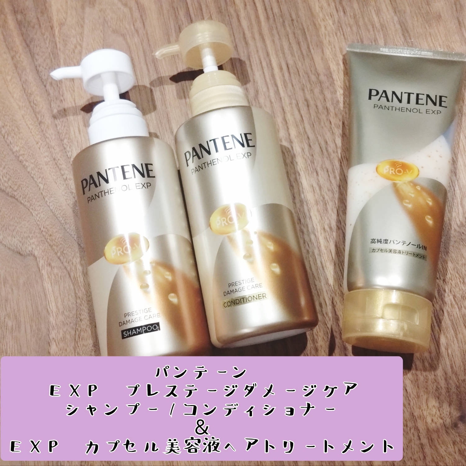 今回使ってみたのは『パンテーンEXP プレステージダメージケア シャンプー/コンディショナー&EXP カプセル美容液ヘアトリートメント』